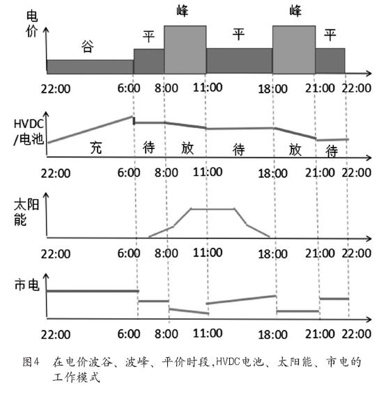 高压直流型储能方案如图3所示,它打造了一个直流微网的方案,通过高压直流给电池充电,同时给设备供电。这套方案可以将光伏、风机无缝并到直流系统里面,组成储能系统,但是原有系统却无需改造。在电价波谷、波峰、平价时段,HVDC/电池、太阳能、市电的工作模式如图4所示。