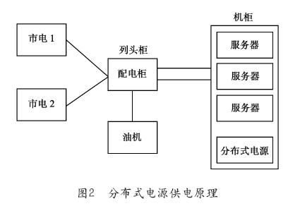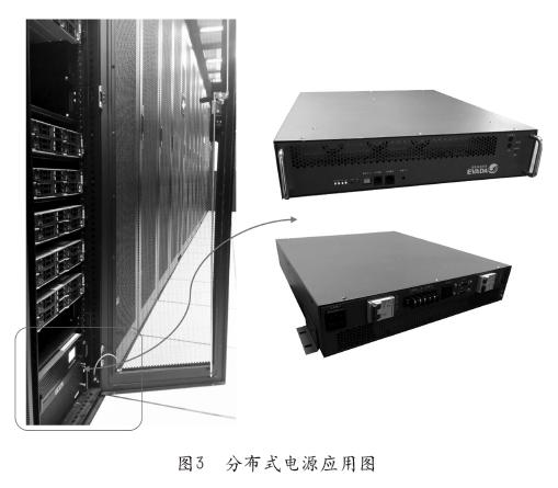 分布式电源针对每一个机柜单独提供后备电源,在市电正常情况下,分布式电源向服务器输出交流电;当市电不正常或中断时,分布式电源切换到电池供电状态,通过磷酸铁锂电池箱输出220Vac电源,切换时间小于10ms,不会导致服务器闪断,从而保证设备的不间断供电,如图3所示。