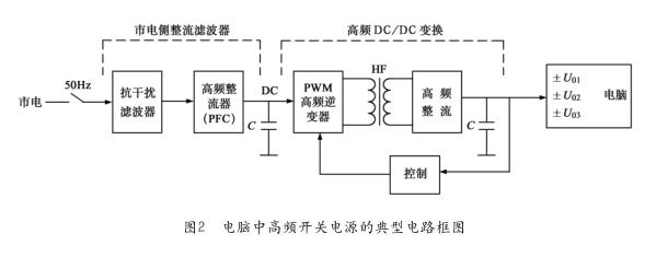 为了减小低压大电流时线路压降、减小电源故障的影响范围,提高供电的可靠性,一般在小型电脑中都采用了高频开关电源,具体电路可能不完全相同,但其基本结构与组成是大致一样的,其典型电路框图如图2所示。它主要由抗*滤波器、高频整流器(PFC)和电容平滑滤波器三种电路组成的市电侧整流滤波器,以及由PWM高频逆变器、高频稳压隔离变压器、高频整流器、高频滤波及控制电路组成的高频DC/DC变换器两大部分组成的,输出低压直流电压为± U 01 =±12V;± U 02 =±5V;± U 03 =±3V,供电脑内部电路使用。允许输入市电电压的变化范围为165~270V,输出电压的稳定度为0.6%~1%。同时由图2也可以看出,高频开关电源的电能变换程式与图1所示的工频与高频交流UPS是基本相同的,这也为用高频开关电源制成UPS的新思路打下了基础。
