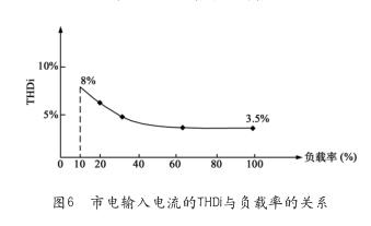 系统负载率的减小可以使供电系统的效率下降,如图5所示,也可以是市电输入电流的THDi增大,如图6所示,因此对市电的污染程度也增大了。