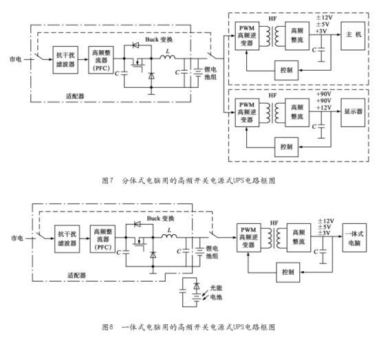 其中图7所示为专用于分体式电脑的。图8所示为专用于一体式电脑。因为一般现有的小容量锂电池组的电压都比较低,所以必须用Buck DC/DC变换器,使高频整流器(PFC)的直流输出电压与锂电池组的直流电压相匹配,以利于锂电池组充电。由抗*滤波器、高频整流器(PFC)、Buck变换器组成的电路,由于是高频开关电源式UPS电路的一个组成部分,其作用主要是与后面的电路共同完成UPS功能,其次才是对锂电池组充电,所以叫适配器,不叫充电器,一般把它制成独立电器作为电脑的一个附件使用。