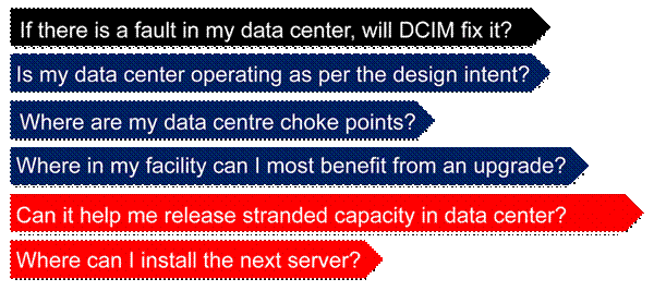 没有人可以准确定义描述DCIM或DCIM应该做些什么。而一个错误的假设是,DCIM将修复你的数据中心,因此在图5中的第一个问题是DCIM产品在市场上的虚假陈述的问题。现实情况是,DCIM的一个最基本的功能应该是对于基础架构的性能和需要关注的突出问题提供一个更为深刻的见解,并解决重大风险。最值得注意的是,这些领域包括数据中心是否在设计意图实施,基础设施的容量限制(“瓶颈点”),资本项目的评估,确定闲置的容量,并为下一次部署的服务器分配一个合适的位置。