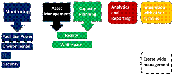 电力设施监测包括详细的电气参数,如不同子系统功率、电压和电流,从而使工程团队来管理和理解配电,并且还支持容量规划和设施扩建。环境控制包括监控所有的加、通风和空调(HVAC)子系统,包括消防、燃气及供水系统和控制。安防监控包括人员在数据中心的活动跟踪,包括识别。IT领域子系统应监测数据中心的空间、电力和冷却设备,数据中心运营商和客户服务水平的要求是不打折扣的的。许多DCIM系统提供允许读取单个IT组件性能的跟踪模块,提供有关利用、能耗等数据。