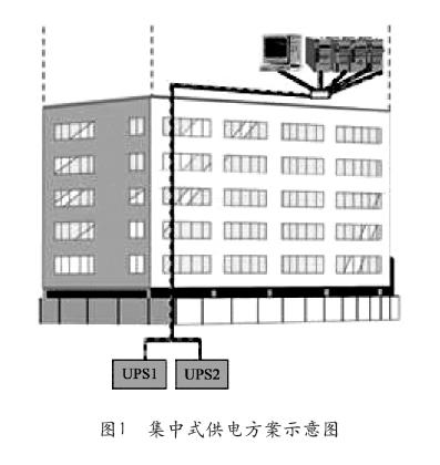 由一台UPS组成单机供电系统、多台UPS组成并联供电或双总线供电系统,再通过配电集中给负载供电,这种供电方案一般情况下UPS系统与机房用电设备是分开的。该供电方案一般UPS的单机容量在200~400kVA较多,供电示意图如图1所示。