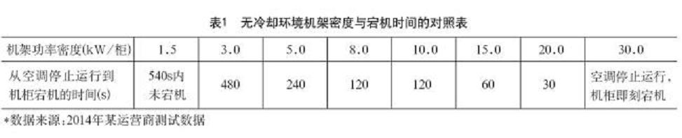 表1为2014年某运营商机架密度与宕机时间对照表,可以看出,机架密度达到5kW/柜后,一旦空调停止运行,机柜仅持续4min后即宕机,并且随着机柜密度的提升持续时间会变得更短。因此停电后即使负载有UPS继续供电,哪怕电池备电时间延长也是毫无意义的。