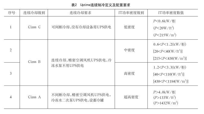 在Uptime机构的Tier等级标准中,把数据机房的连续制冷划分为三个级别,对功率密度在4kW/柜及以上的高功率数据机房都提出了连续制冷的要求,并给出了对应的解决方案,如表2所示。