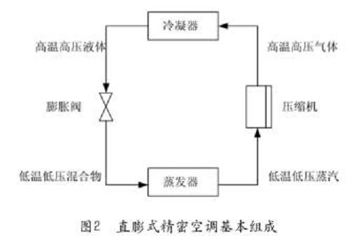 直膨式丝瓜视频污染APP系统由蒸发器、压缩机、冷凝器和节流装置(膨胀阀)组成。图2为直膨式空调系统的基本组成。实际使用时,为了便于蒸发器和冷凝器工作,需要为它们各自配套强制对流的风机,并将蒸发器和冷凝器安装在不同的室内和室外两个壳体内(也称室内机和室外机)。