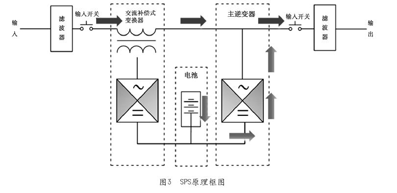 SPS储能式不间断电源系统采用并联式结构,可实现AC/AC和DC/AC的并行输出,如图3所示,因此某一线路中单个部件损坏并不会影响整个系统的正常运行,相比于传统UPS的串联式结构,其线路中任一处故障都会影响系统的正常输出,储能式UPS具备了更高的可靠性。
