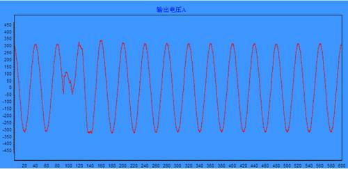 将具有IGBT短路检测功能的两个UPS模块插入UPS机柜,短路其中一个功率模块的逆变IGBT,利用功率模块的故障录播功能,功率模块在发生逆变IGBT短路时自动保存逆变IGBT短路时刻前后的输出电压波形。该波形如下图所示: