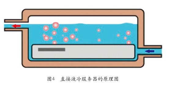 直接液冷服务器又叫浸没式液冷服务器,其原理图如图4所示。如图中所示,发热元器件与冷媒直接接触,即将服务器主板、CPU、内存等发热量大的元器件完全浸没在冷媒中。由于冷却液与被冷却对象直接接触,散热效果更佳,能一次性解决全部元器件的散热问题,无须额外配置风扇、散热片等。但此系统对原有的风冷系统有较大改动,需制作密封舱体用来盛放冷媒。另外,对冷媒的要求较高,需具备绝缘性好(不导电)、无毒无害、无腐蚀性等物理化学特性。