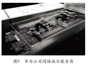 华为公司的液冷刀片服务器采用高集成LCS(Liquid Cooling System)设计,在1个标准的42U机柜中通过部署三台装配有高性能冷板(CH121 CH140刀片服务器)的E9000融合架构刀片服务器,即在部署96个2路刀片服务器的情况下,对86%的器件进行液体冷却,相比传统的风冷散热设计可实现50%~60%的能耗降低,有助于将数据中心PUE值降至1.2以下。华为公司间接液冷服务器如图6所示。