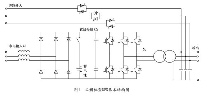 UPS可以分为工频机和高频机。传统的工频机由SCR整流器、IGBT逆变器和输出变压器组成,如图1所示。由于整流器采用的SCR整流技术属于降压整流,造成UPS的输出电压低于输入电压,必须在输出端配备升压变压器才能满足输出电压的要求。