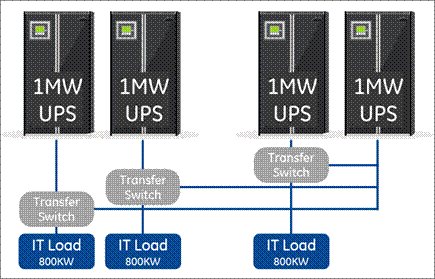 该并联的电源架构的另一个变化是块冗余系统拓扑结构。这种方法采用一种经济的方式来提高系统的可靠性,而无需一个完整的2N系统。它依赖于静态转换开关(STS)和UPS模块的即时处理,以实现有效的载荷,而冗余的UPS具有承担和转移负载的能力,这可以在大多数的块冗余拓扑中实现。然而,STS开关也是一个单点故障。虽然这个系统中UPS模块的利用率得到提高,但其带载率也只到70%~75%。