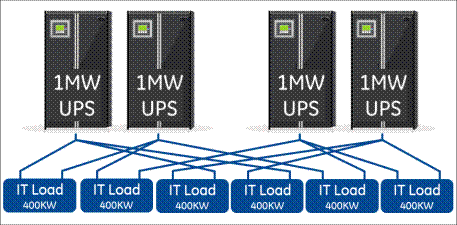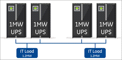 无论是块冗余系统和共享冗余系统都比“N+1”冗余系统可靠性要高,其故障率每年不到一个事件。这种性能非常适合于大多数组织中的数据和应用程序的实时传递,服务交付等核心业务。但这两种冗余系统面临的挑战是,其UPS最大利用率通常小于70%~75%,而实际使用时由于其容量有限,效率还要少得多。块冗余或共享冗余系统中,UPS和关键电力资产并没有得到充分利用,而供电系统实际部署的关键负载可能会经常变化,这是因为数据中心运营中,经常会有添加、删除、升级或转移IT负载、服务器等设备的情况。