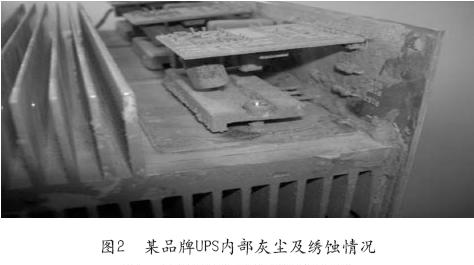UPS对环境湿度有严格的要求,要求使用环境湿度10~90%RH不能结露。若湿度过高,在遇冷气时,会在设备内形成水雾或细水珠,尤其在南方潮湿的雨季,结露容易造成电路板短路。商用UPS一般按照IEC529-598规定的IP20等级设计,即可以防止直径大于12.5mm的外物侵入,防止手指接触内部零件,没有对湿度的防护要求。高速铁路电力使用的UPS装于箱变内,在户外使用,箱变内没有温湿度调节系统,使用环境恶劣。图2为箱变内某品牌UPS内部灰尘及锈蚀情况。