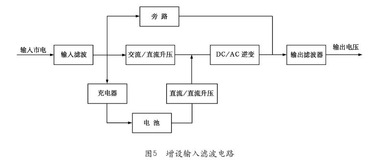 (3)新UPS在设计时,电源输入测增设滤波电路,抑制输入电源的谐波电压峰值,减少因直流电压过高而引起的UPS自动关机故障,提高蓄电池的使用寿命。