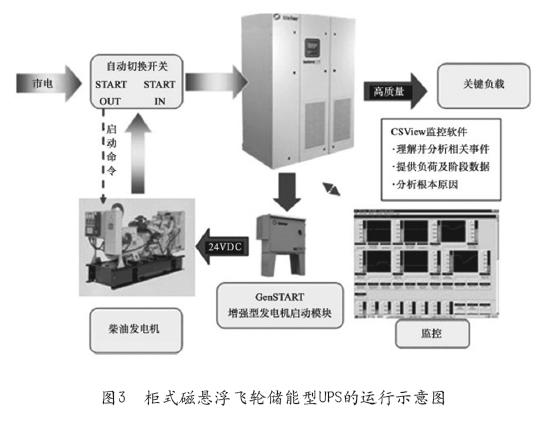 在传统UPS供电系统中,当电力发生中断时,蓄电池会支撑系统正常运转,与此同时,柴油发动机开始启动,以此保证数据中心主机正常工作、空调连续运转。蓄电池型UPS在此过程中,提供了“分钟级”的电力供电。而飞轮储能型UPS受制于机械储能,仅仅能够提供30s到1min电力供电,这也是飞轮UPS被诟病的主要原因。然而,专家指出,如今,市电电源的可靠性达到99.9%,有些重要的负载都采用双路市电供电,市电的可靠性可以说已经达到了99.99%。万一市电中断,后备电源的可靠性也可以达到99.9%,从市电到后备电源的切换,在技术上只需要10s的时间,这是一个公开的标准。目前,欧洲可做到8s。可以断定,飞轮储能型UPS能提供30s的电力完全能够满足从市电到后备电源的可靠切换的要求。图3给出了柜式磁悬浮飞轮储能型UPS的运行示意图。
