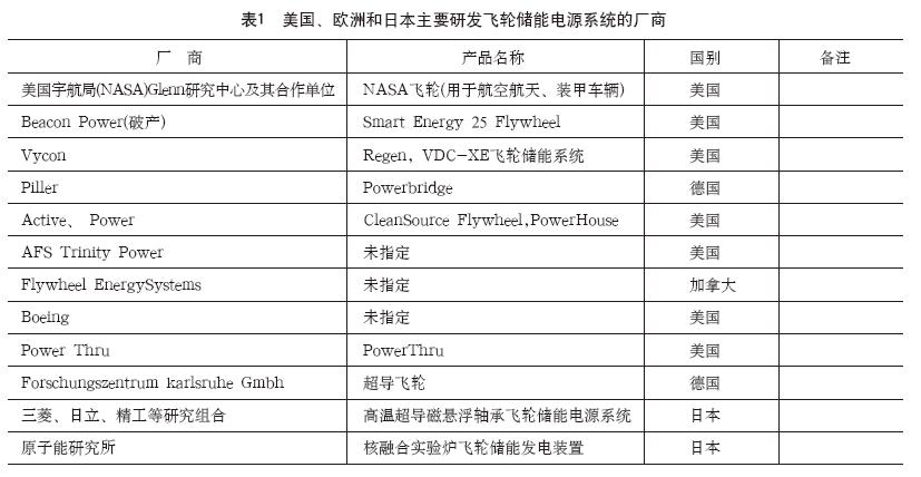 表1给出了美国、西欧和日本几个著名的飞轮储能电源系统的厂商。