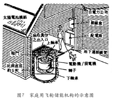 对于普通家庭,储能式飞轮也有广阔的应用前景。家庭用电系统可以采用电力公司供电、太阳能电池组、风力发电机组及微型汽油发电机来保障家庭的电源的不间断供应。而平时多余的太阳能和风能首先可以给后备的飞轮储能机构以及电池组充电,其次也可以用来给室内加热取暖,再次可以通过逆变器给电网反馈,并取得收益。图7为家庭用飞轮轮能机构的示意图。