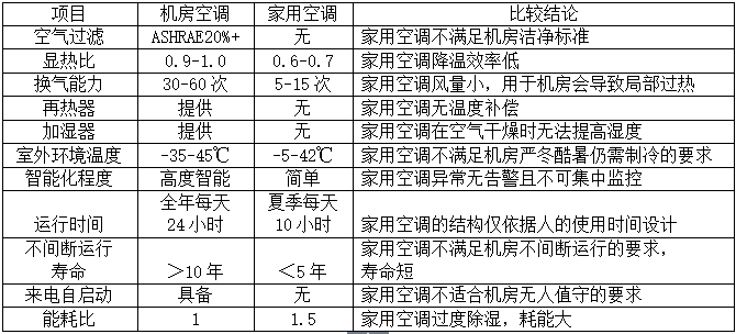 由于机房设备(服务器、UPS等)都会释放大量热量,为保持这些设备安全稳定地运行,就一定要使机房室内保持恒定的温度,空调系统的制冷循环部分就必须为机房源源不断地提供制冷量,同时也具有除湿的功能,家用空调在这方面是远远落后于机房专用空调的。