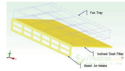 图3:风机的挡板和托盘之间的滤尘器的位置。