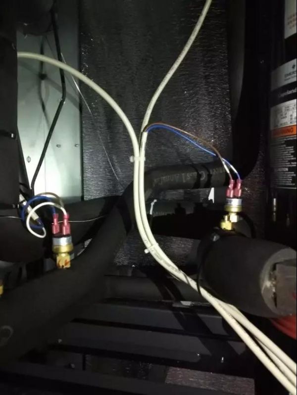 一般情况下高低压力开关自带控制线是与开关密封连接的,没有自带控制线的就需要将导线与开关进行插接连接,问题大多就出现在这样的连接上。由于机组运行时振动和气流的影响,插接点易松动,连接线易断掉,而且连接点是不密封的,很多情况下机组内的冷凝水会飞溅到此,加快腐蚀或产生误动作。